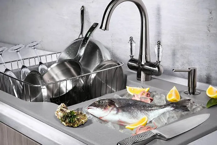 Одно из ключевых преимуществ моек Artgranit — их способность поглощать вибрации. Даже если вы ставите в мойку тяжёлую кастрюлю или глубокую сковороду, звука будет значительно меньше, чем на металлической поверхности.